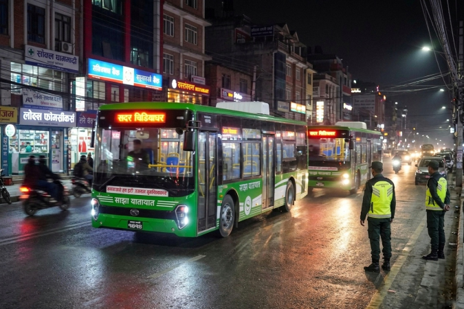 काठमाडौँ उपत्यकामा रात्रिकालीन बस सेवा सुरु, ‘साझा’का विद्युतीय बस राति पनि गुड्ने